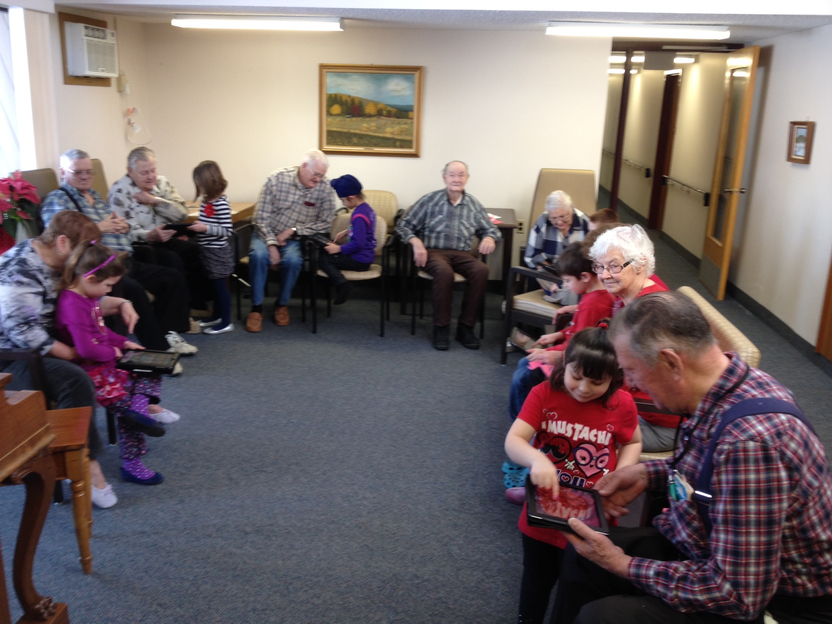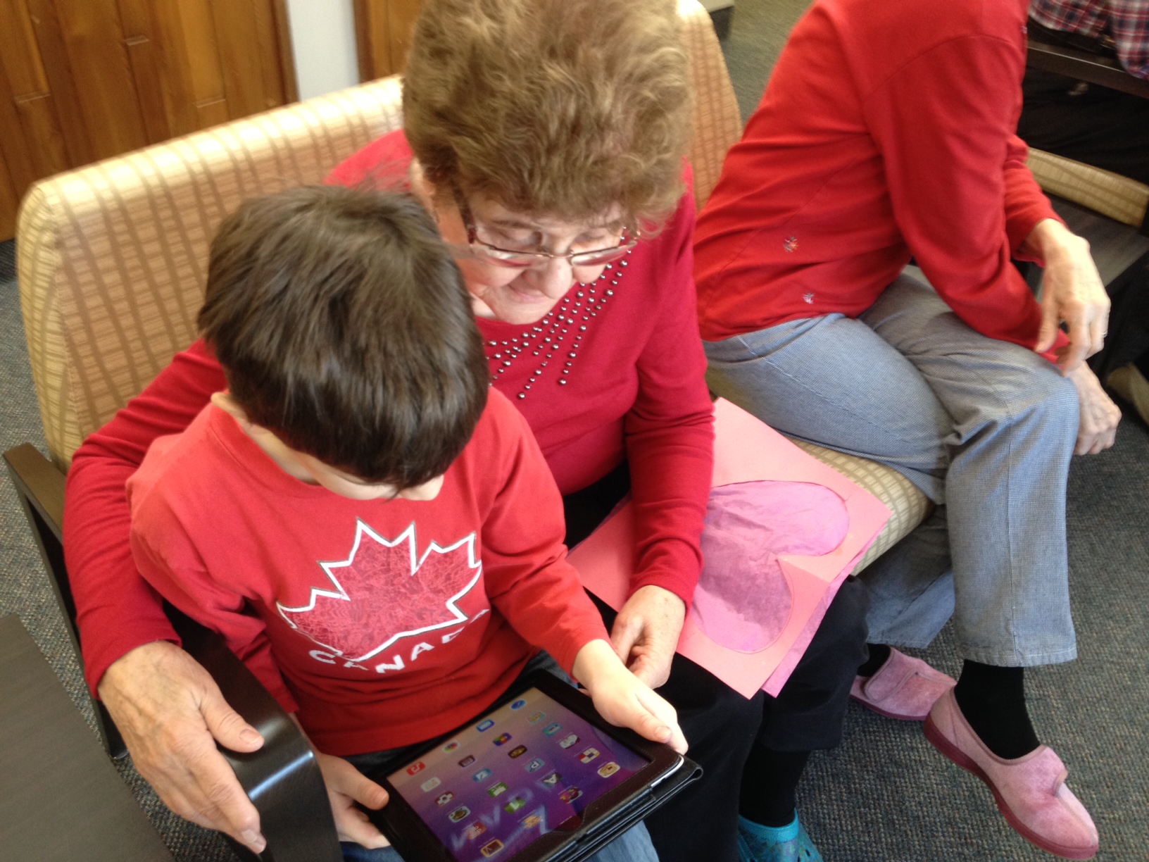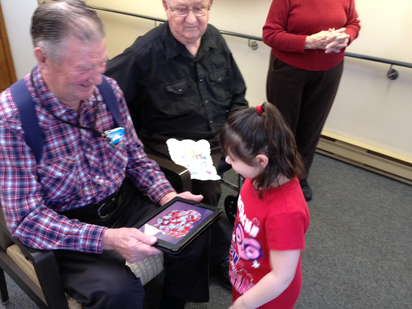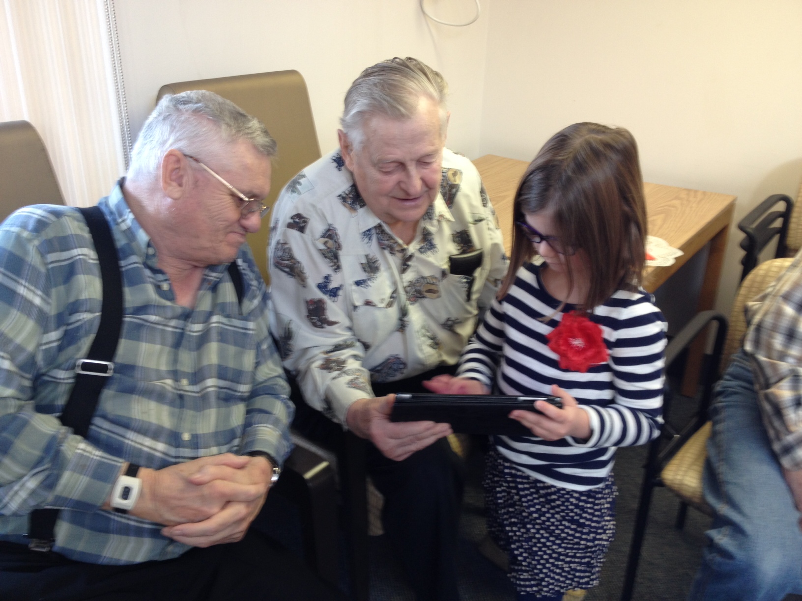 They were very happy to see us! They loved our songs and poems, and we weren’t as nervous or shy as we were the first time we visited. Next we showed them our tablets and how to use them. Some of the seniors said that they would probably break them because they didn’t know what to do. We told them that the only way that you can break it is if you drop it really hard on the floor. That seemed to make them feel better! We showed our senior buddies how to turn the tablets on and off, and what to do if you want to get back to the home screen. We had Valentine’s games on our tablets and we played them together. We also showed our senior buddies how to use storytelling and voice recording apps that we use to share and explain our learning. A lot of our buddies are really interested in learning to use Skype so they can talk to their families who are far away. We think that this would be great but the big problem is that there isn’t any wireless internet at the seniors’ residence.