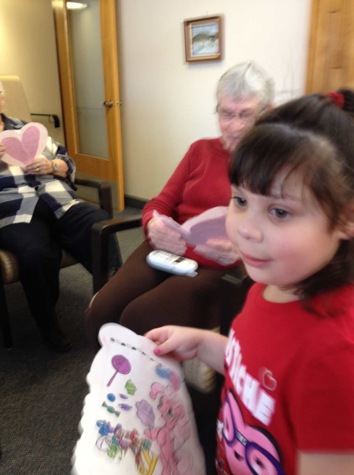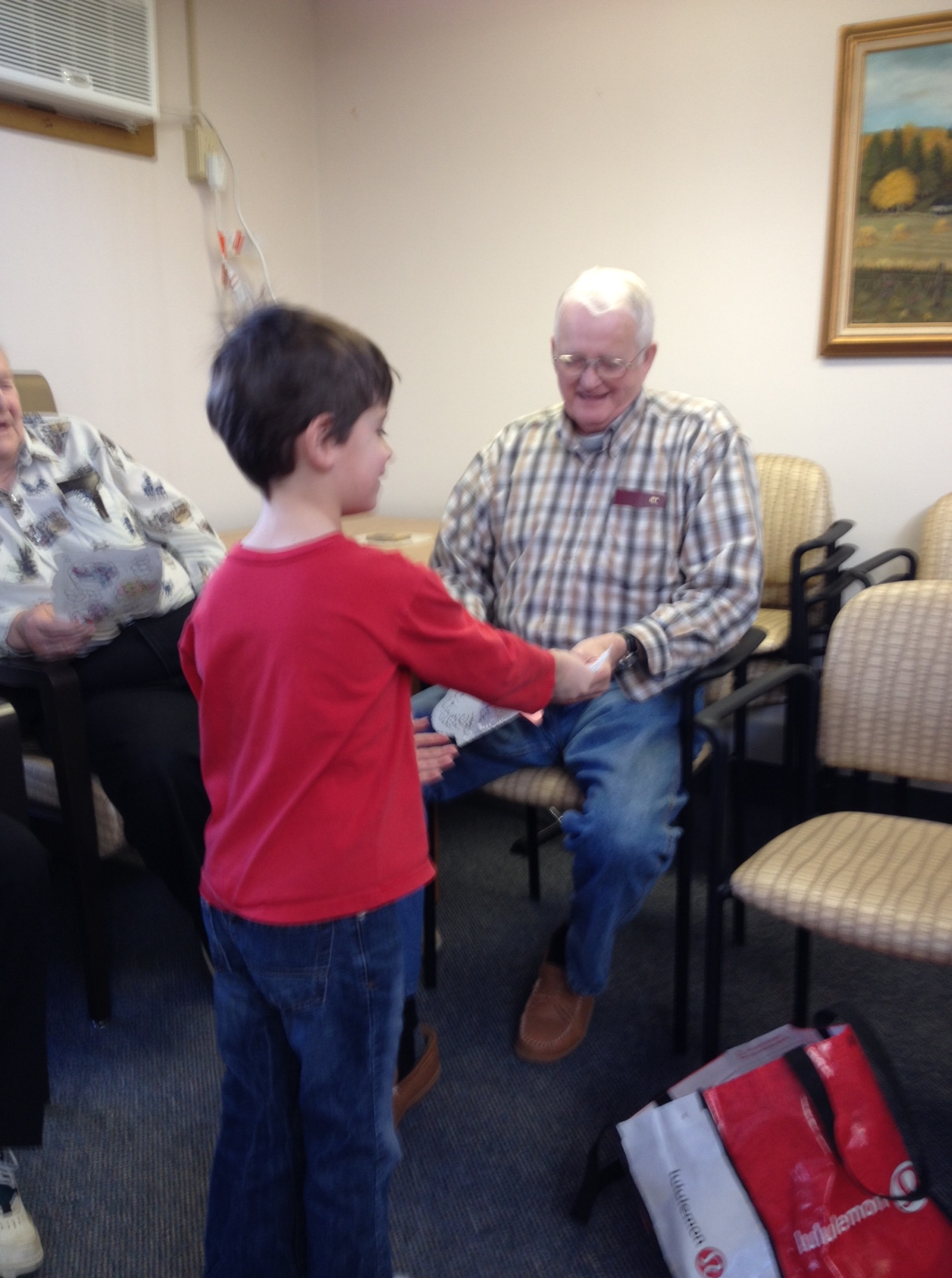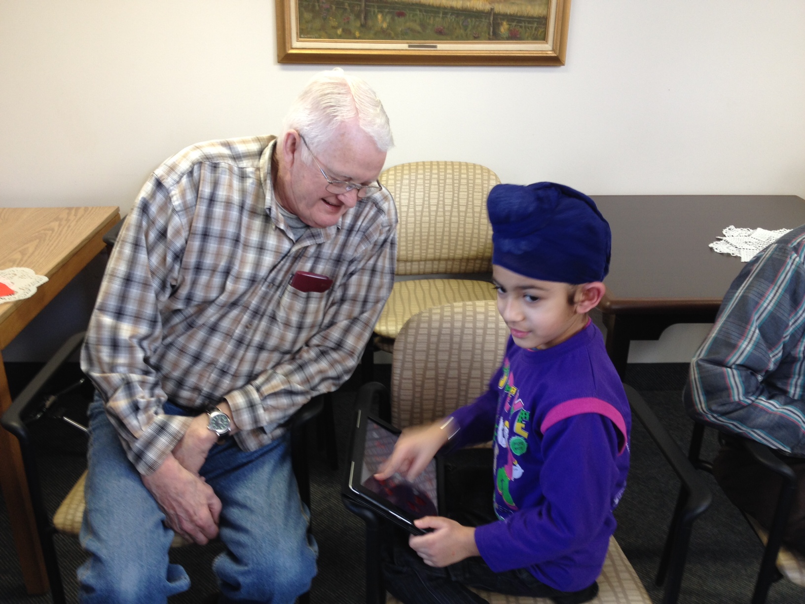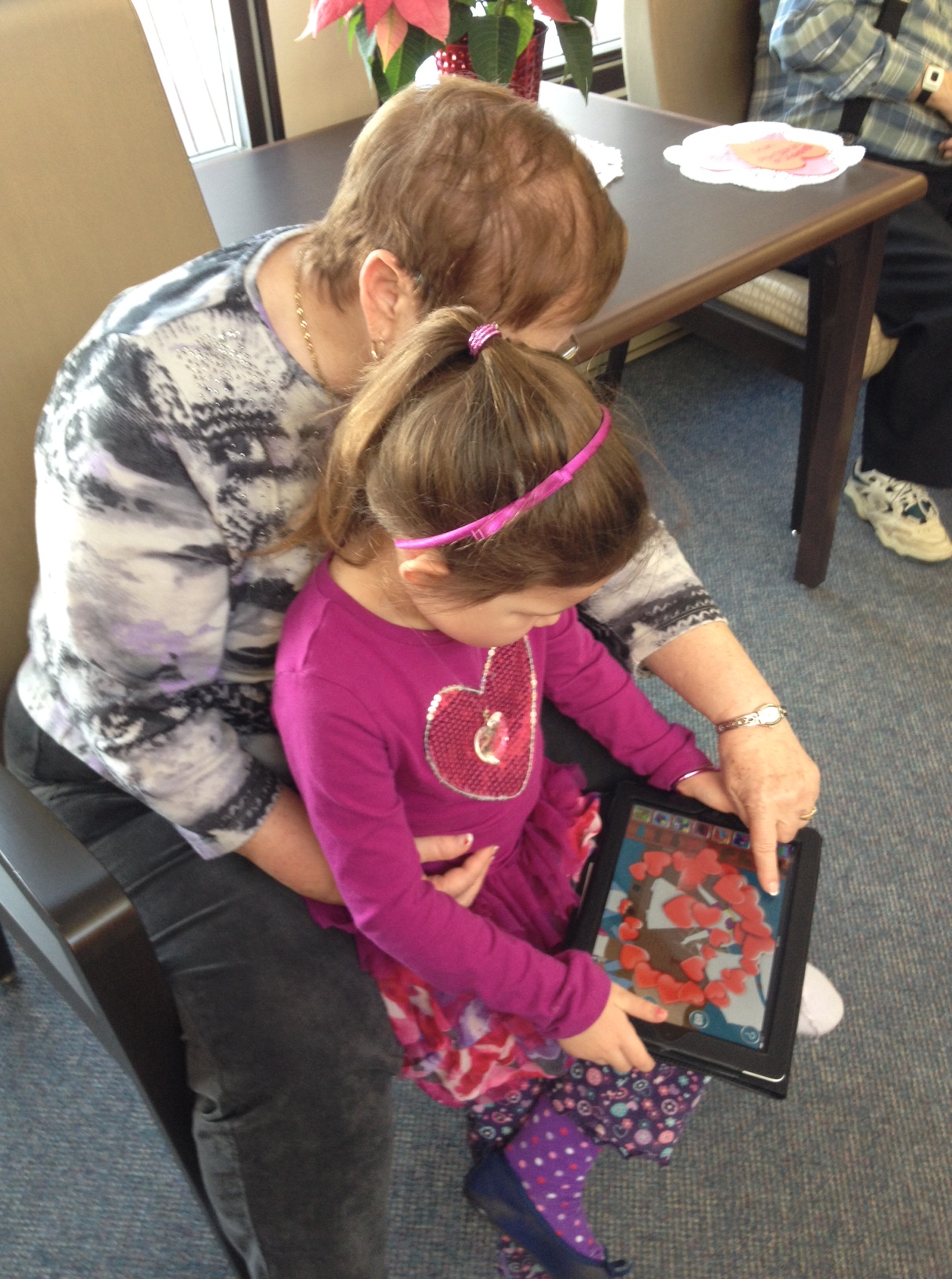 They were very happy to see us! They loved our songs and poems, and we weren’t as nervous or shy as we were the first time we visited. Next we showed them our tablets and how to use them. Some of the seniors said that they would probably break them because they didn’t know what to do. We told them that the only way that you can break it is if you drop it really hard on the floor. That seemed to make them feel better! We showed our senior buddies how to turn the tablets on and off, and what to do if you want to get back to the home screen. We had Valentine’s games on our tablets and we played them together. We also showed our senior buddies how to use storytelling and voice recording apps that we use to share and explain our learning. A lot of our buddies are really interested in learning to use Skype so they can talk to their families who are far away. We think that this would be great but the big problem is that there isn’t any wireless internet at the seniors’ residence.