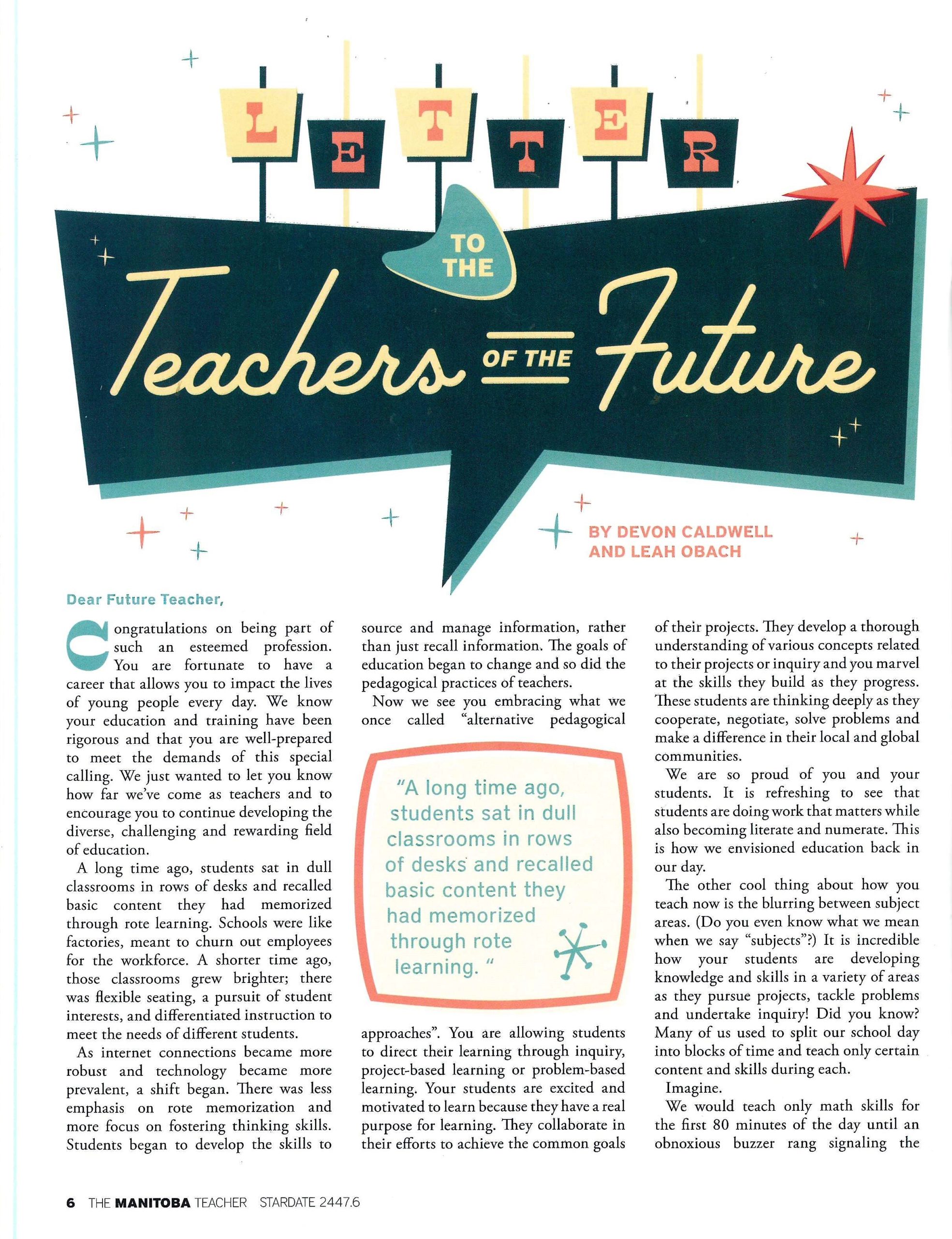 Caldwell, D., & Obach, L. (2019). Letter to the teachers of the future. The Manitoba Teacher, 187(6), 6–7.